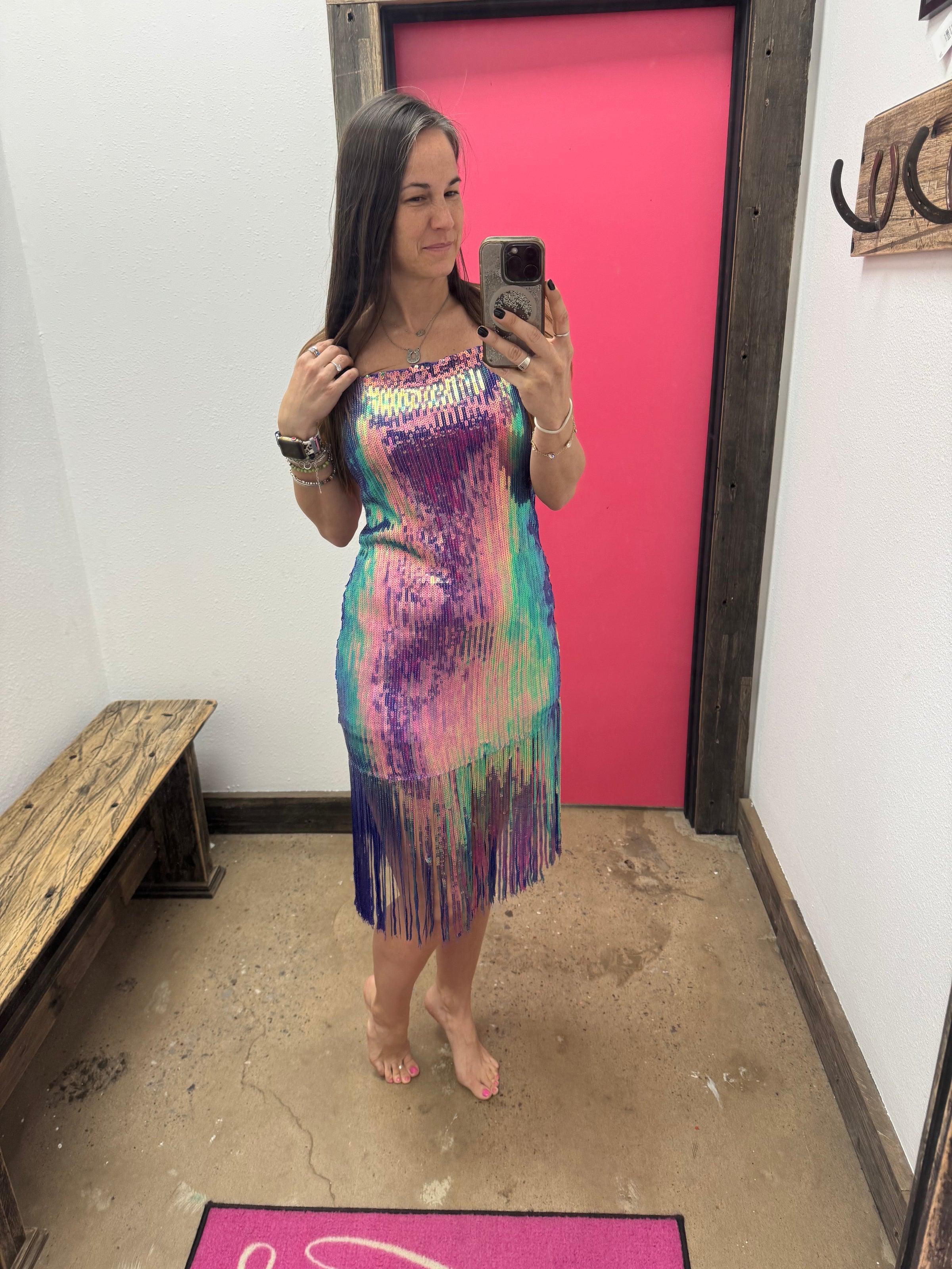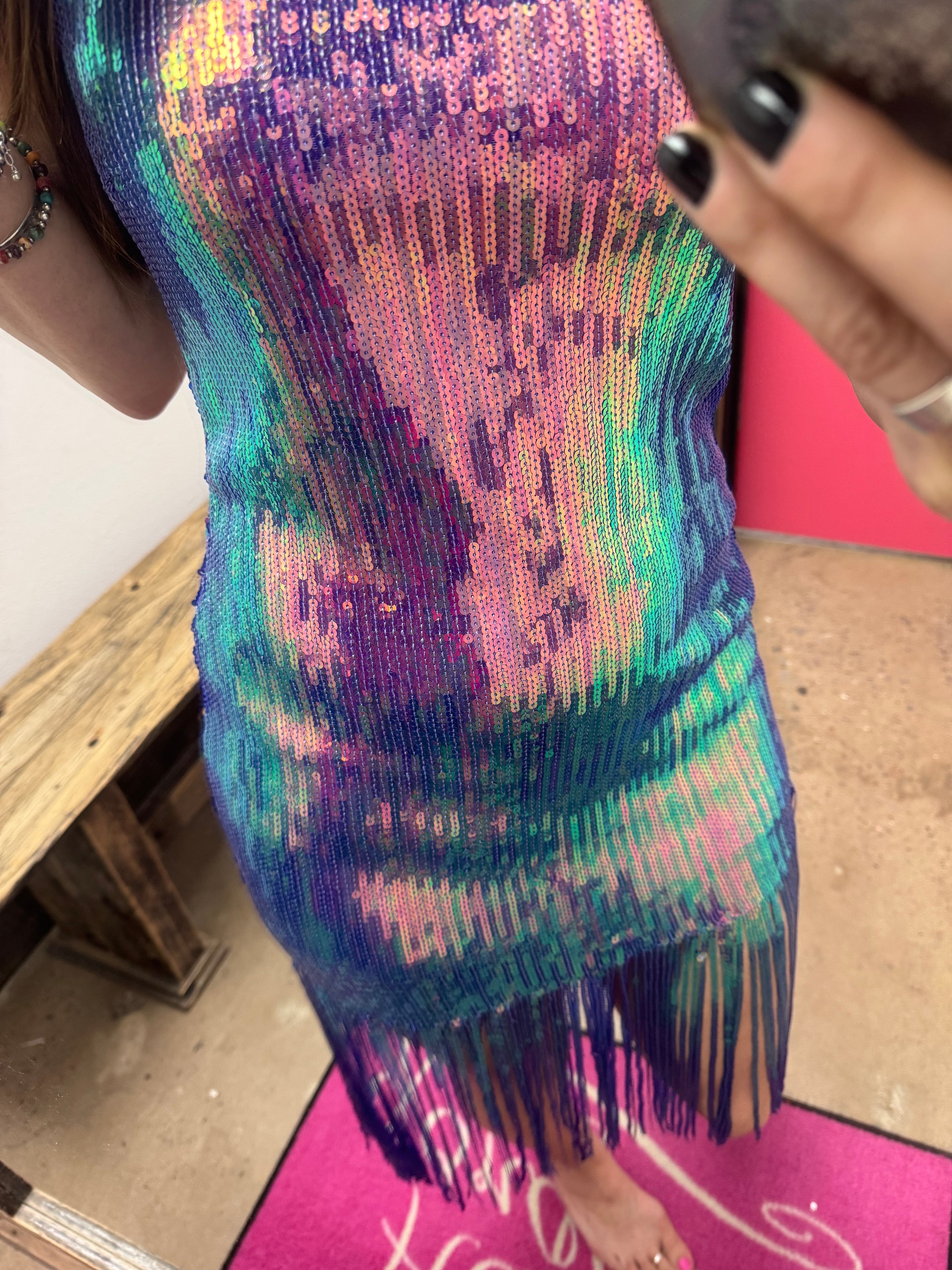 The Purple Fringe Sequin Dress is the perfect addition to any special occasion outfit. Its fancy design features eye-catching fringe and shimmering sequins, making you stand out in the crowd. With its unique style, this dress is sure to make a statement and leave a lasting impression.