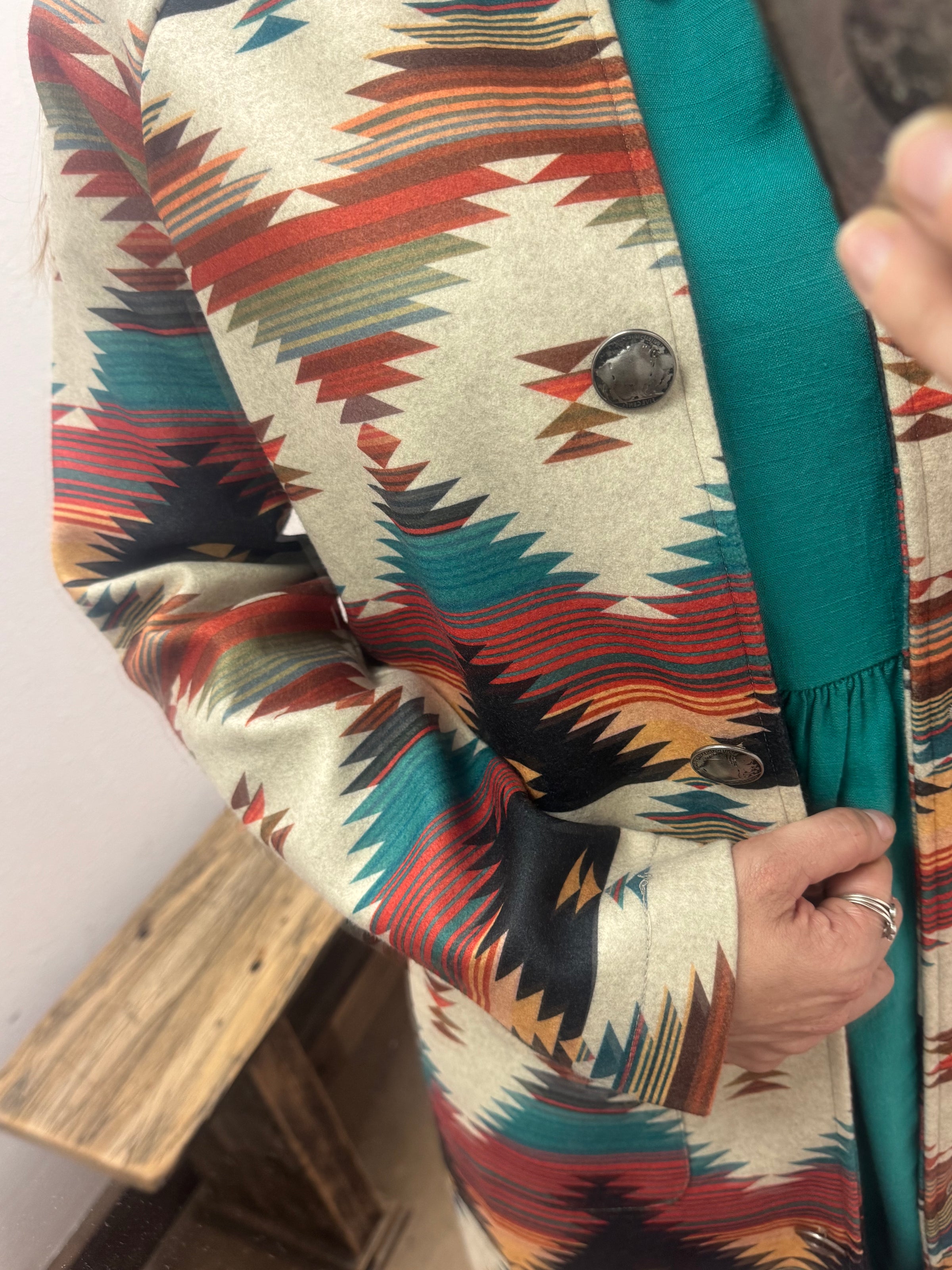 Get cozy with our Southern Roots Jacket featuring a playful Aztec print and charming buffalo nickel buttons. Perfect for those who want to add some unique flair to their style. You'll be turning heads and keeping warm at the same time!