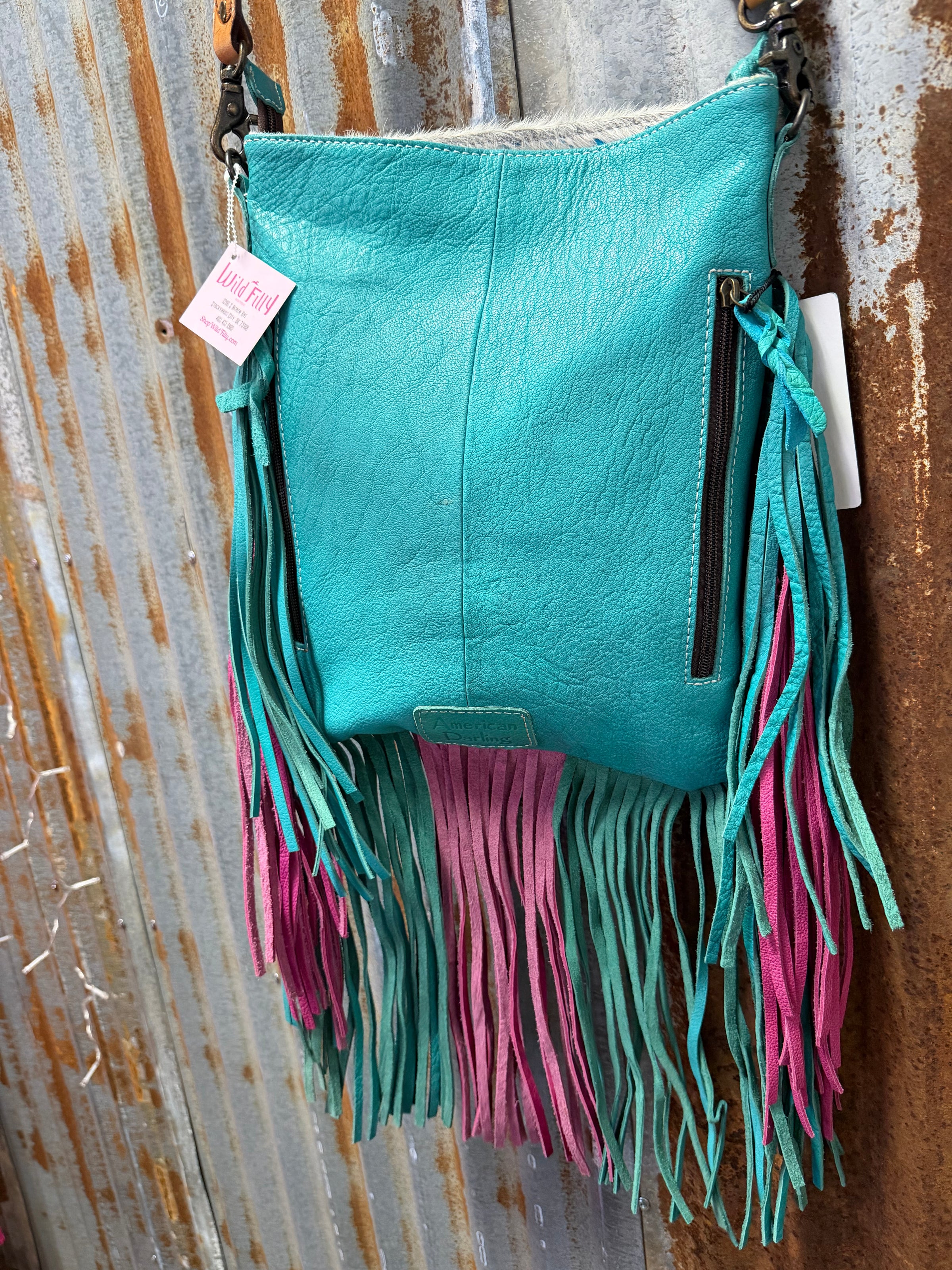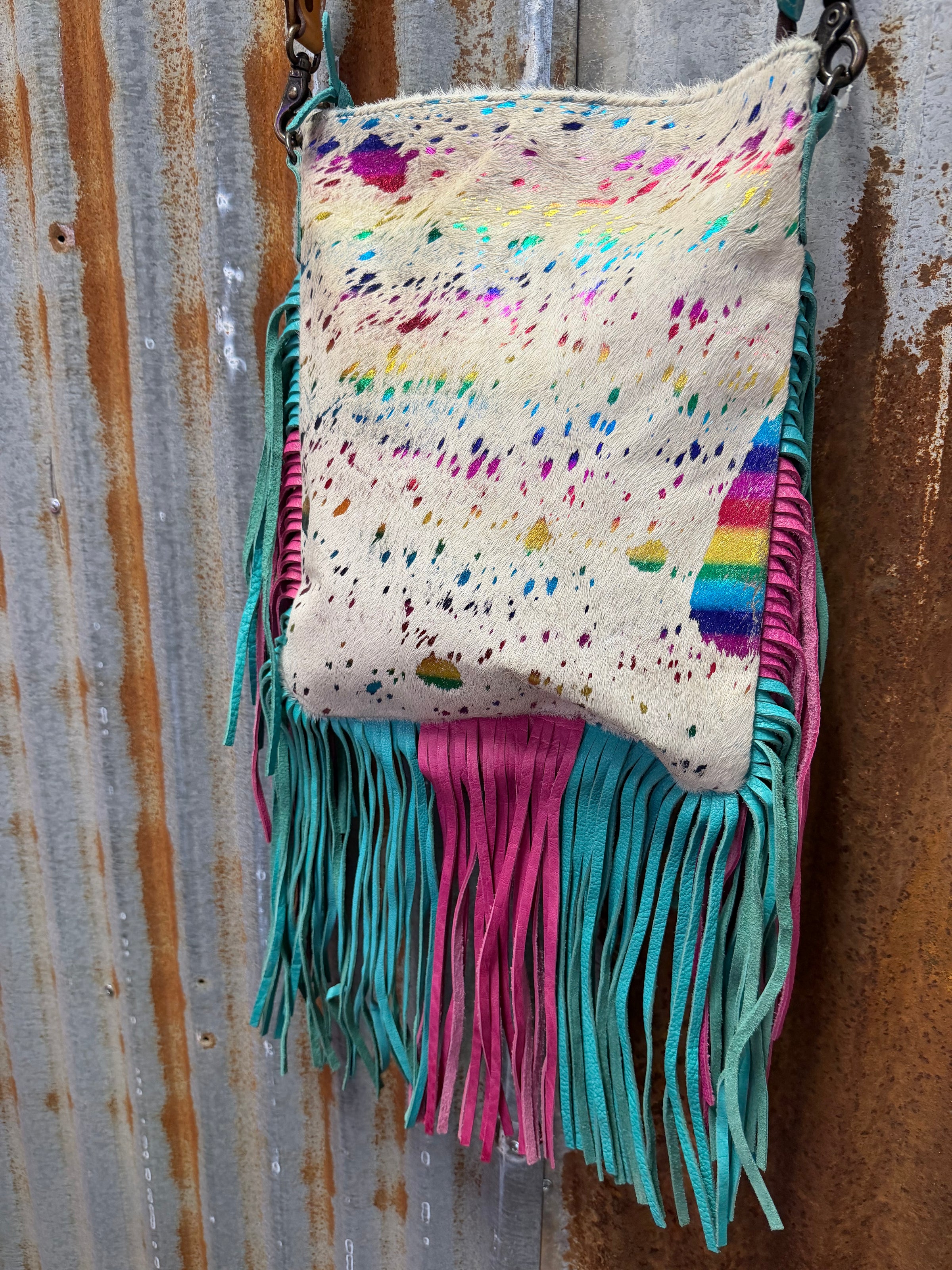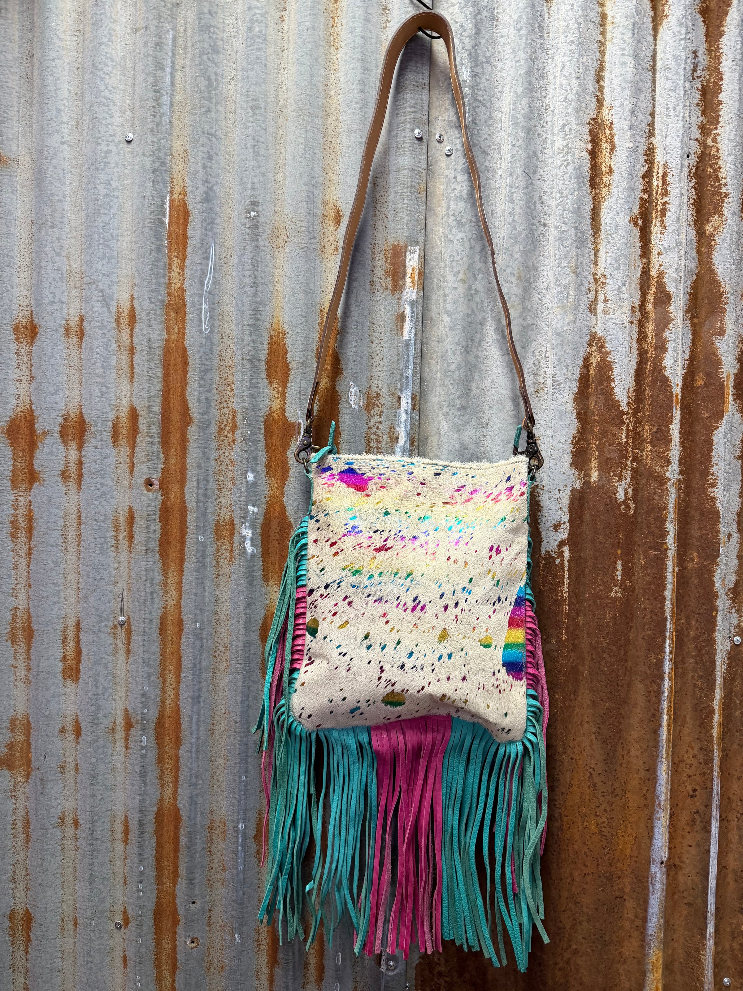 Messenger Confetti Hide Purse Pink & Turquoise Finge