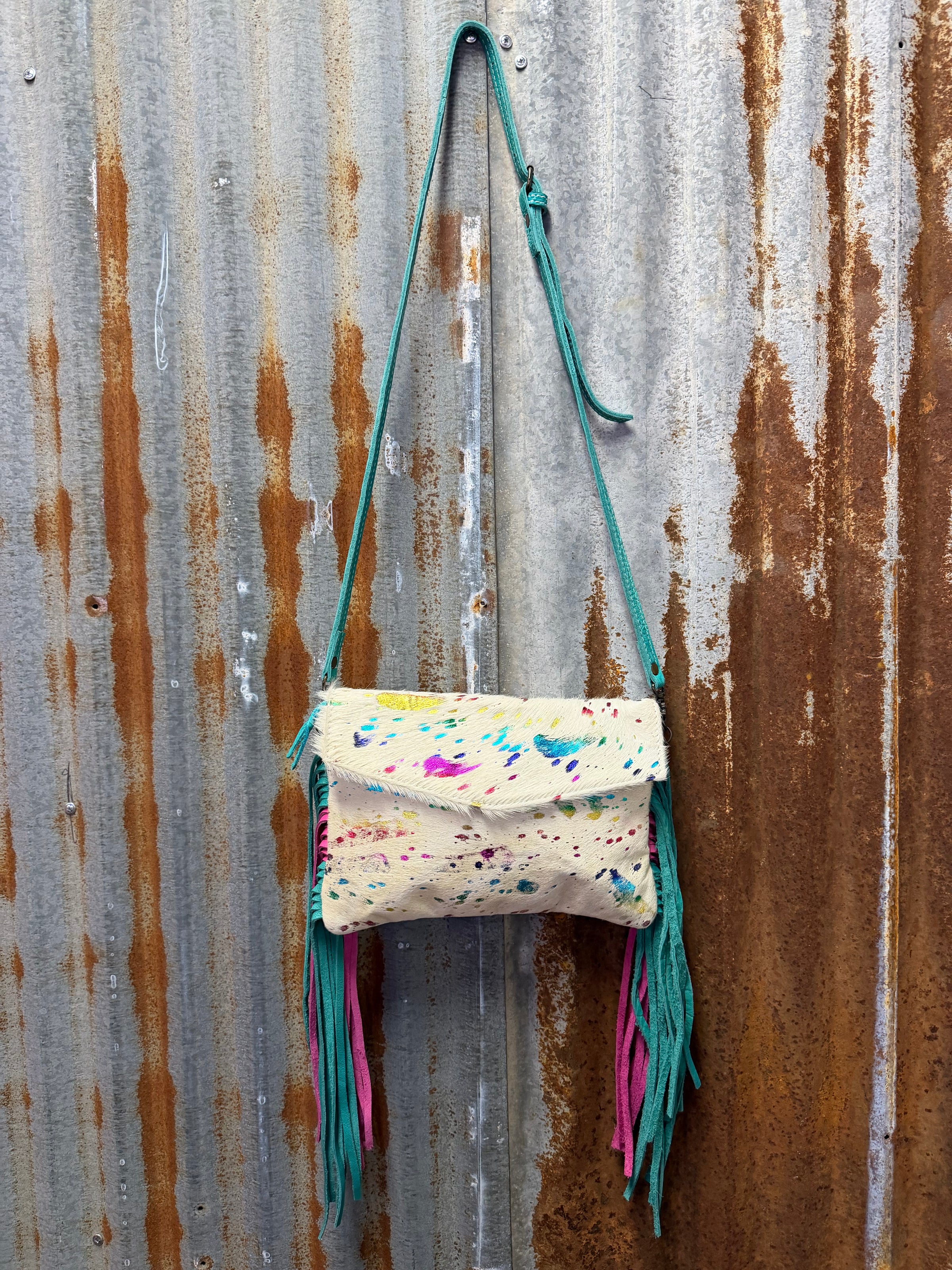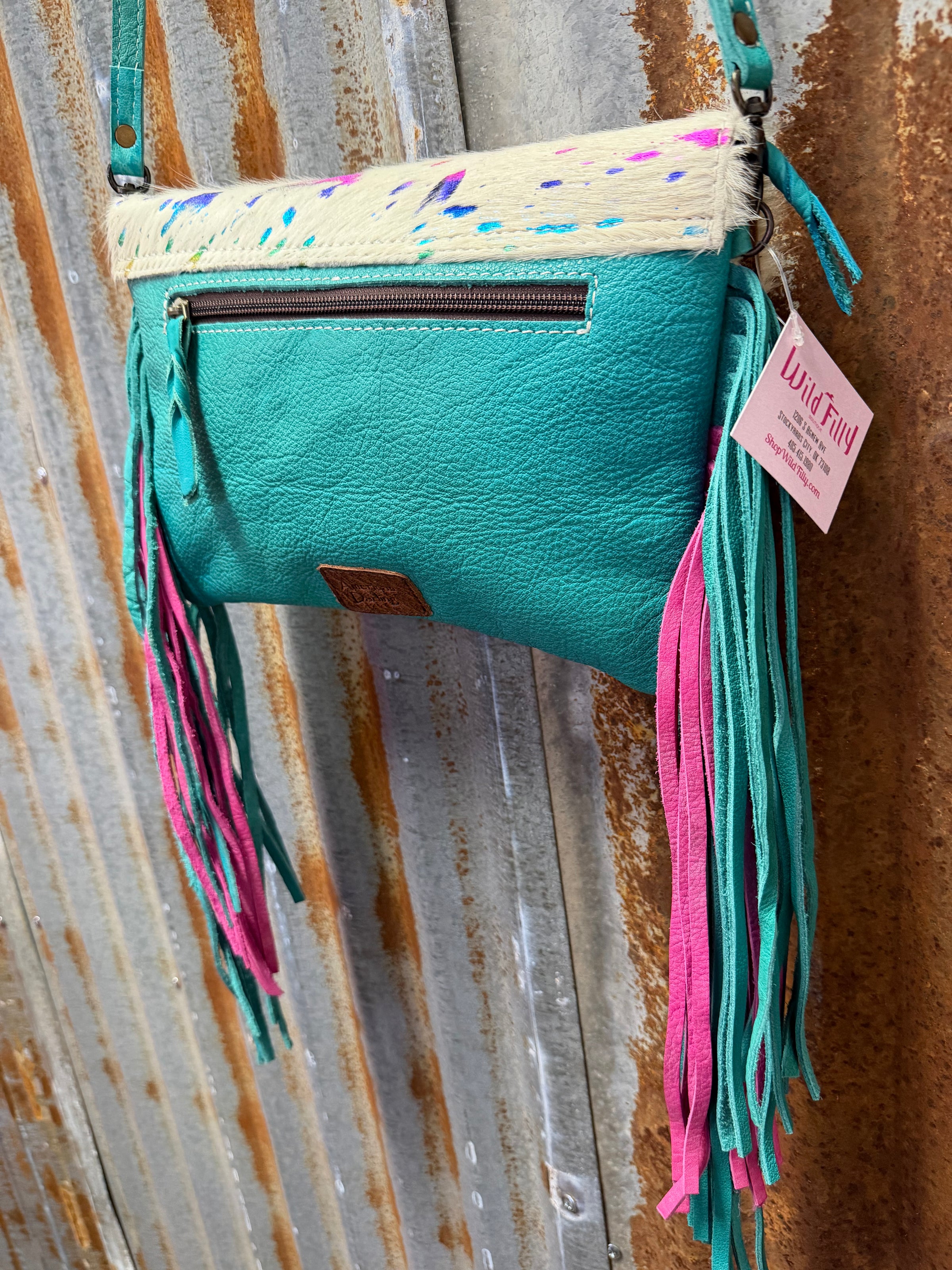 Carry a splash of personality with this vibrant tooled handle purse crafted from genuine confetti hide. Each piece showcases nature's own color palette—no two are exactly alike. The expertly tooled handles add rustic charm and durability, while the spacious interior keeps your essentials organized in style. Perfect for the free-spirited fashionista who refuses to blend in. Grab yours and let your wild side show!