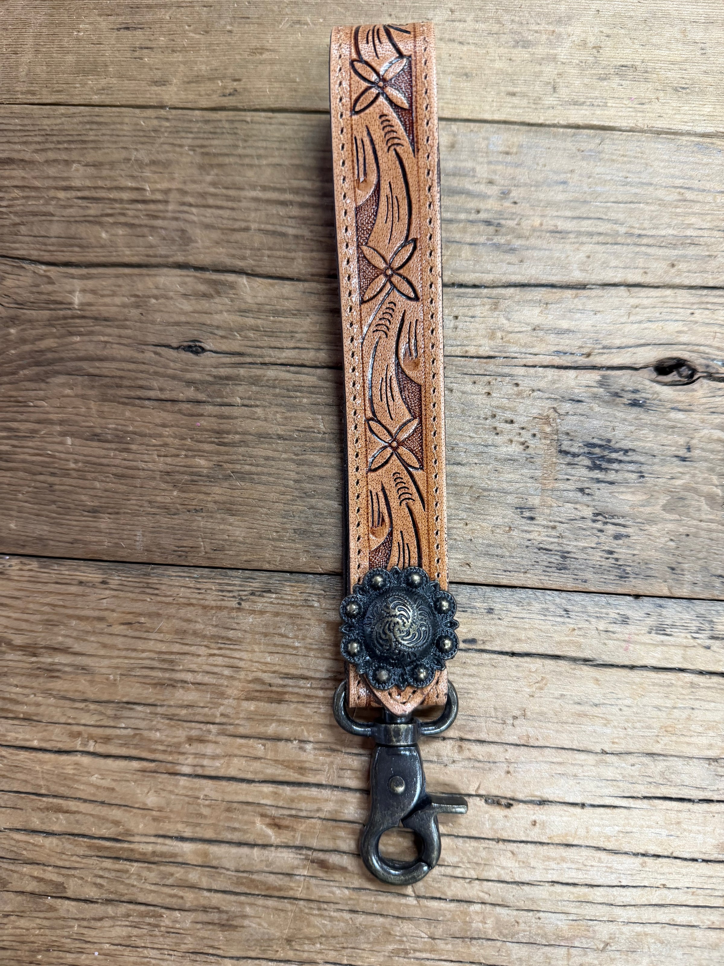 Crafted from high-quality leather, this Tooled Wristlet Keychain with Concho is a must-have accessory for any on-the-go individual. The soft and durable leather offers a sophisticated touch to your daily routine while keeping your keys securely in place. Upgrade your style and convenience with this stylish and functional keychain.