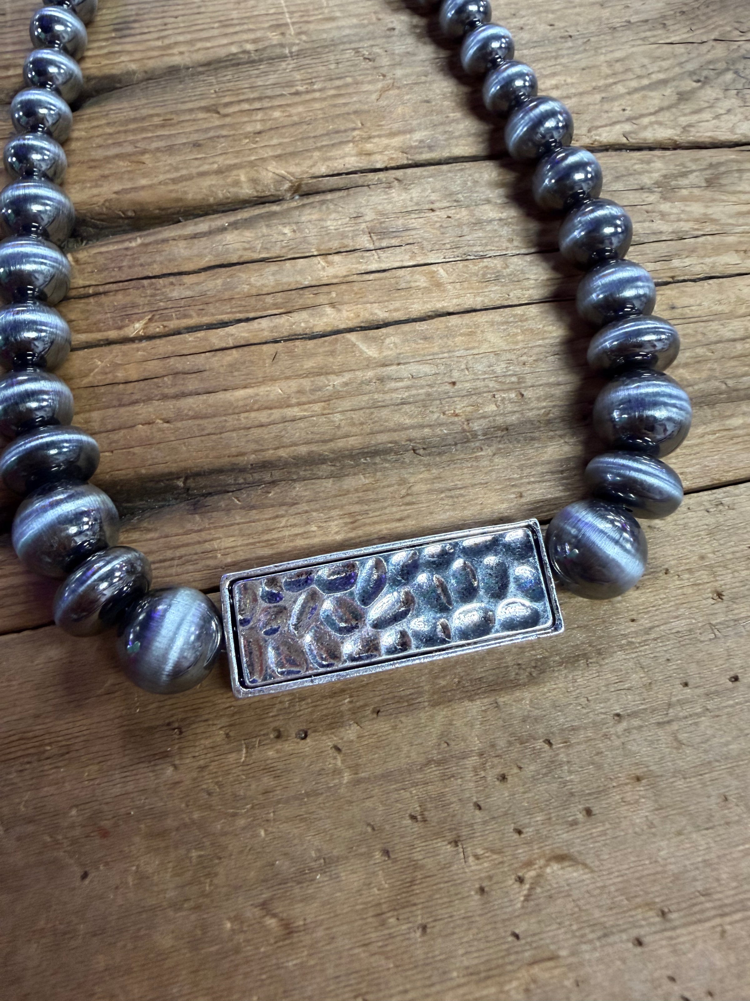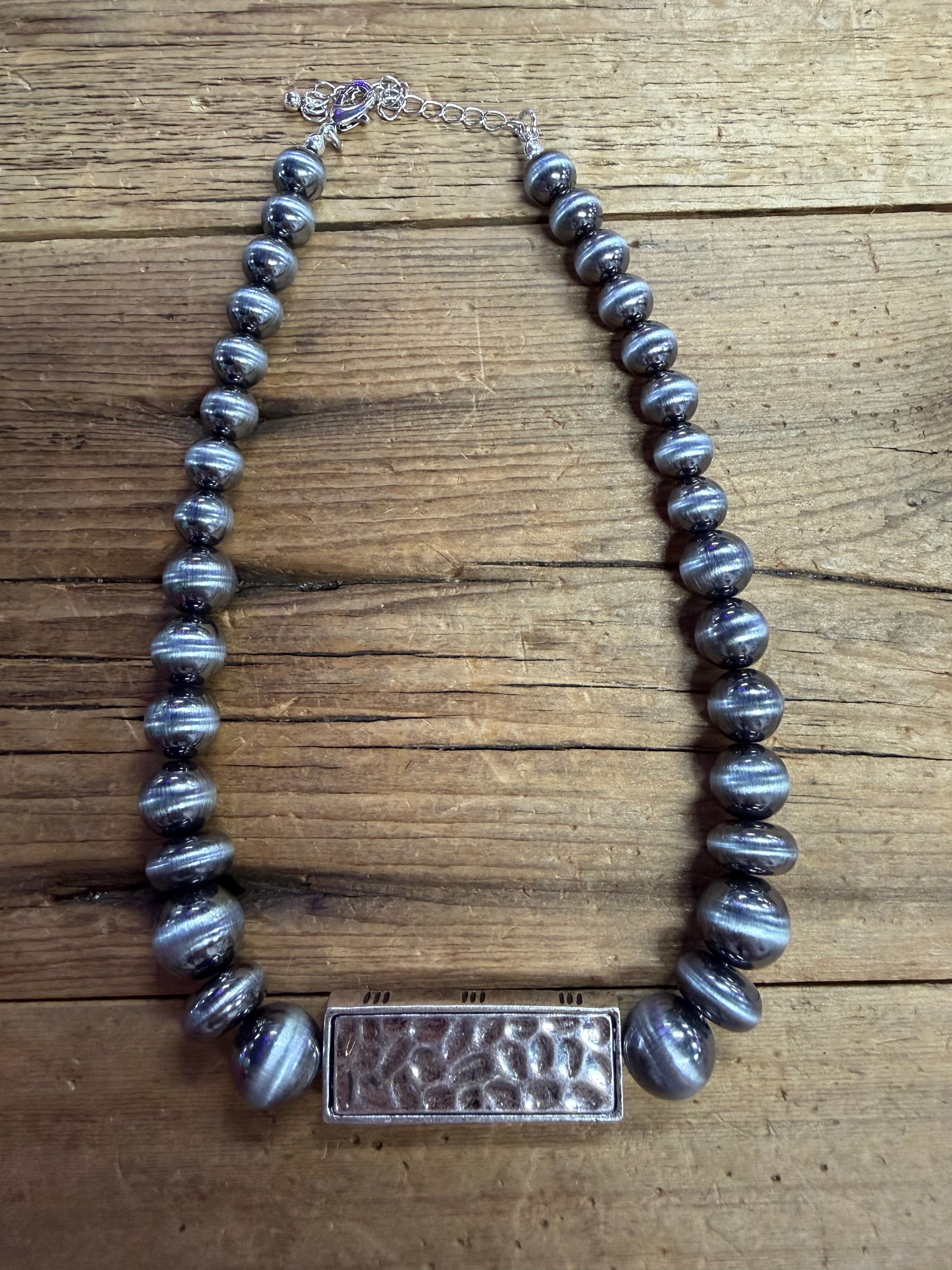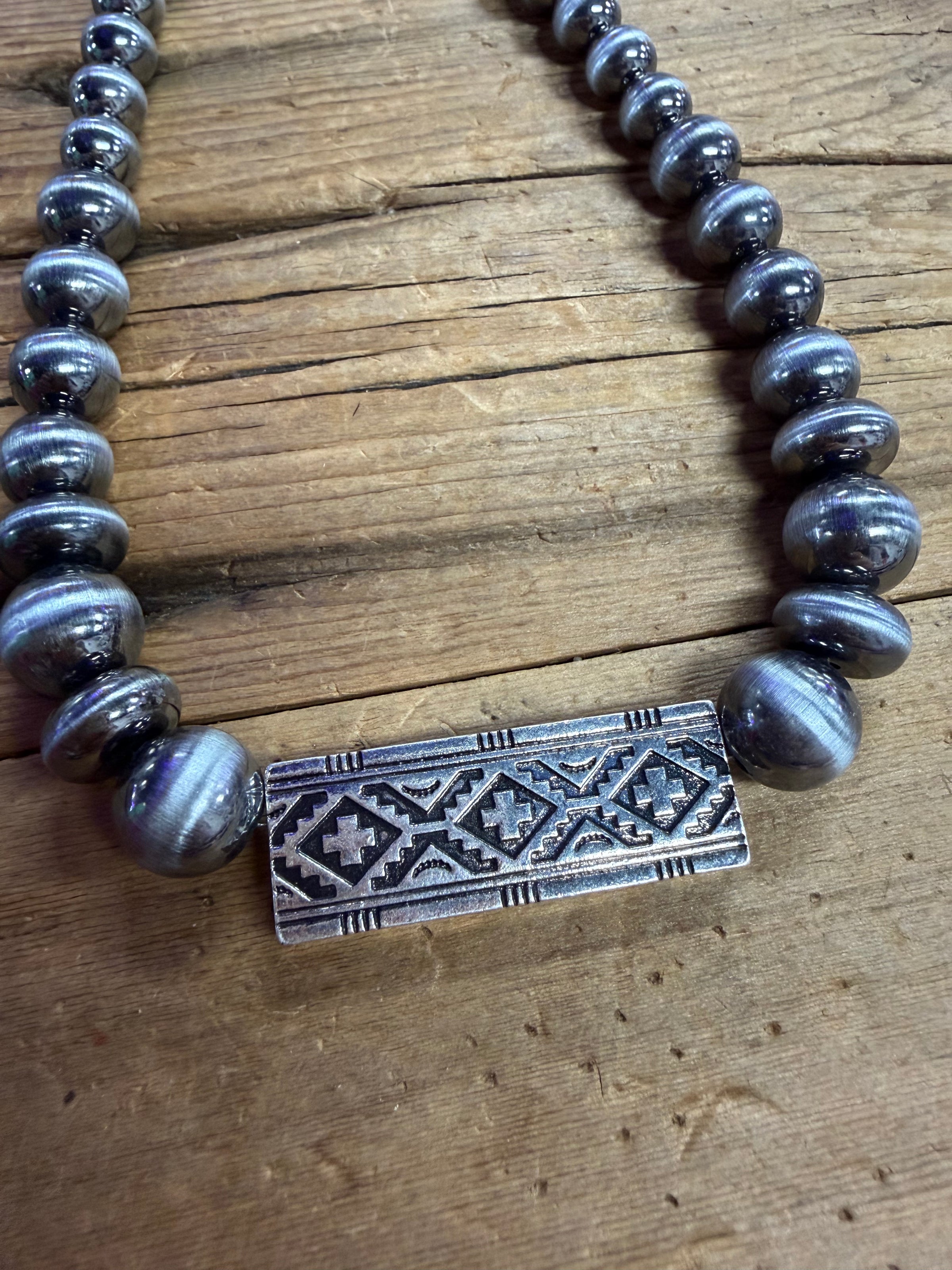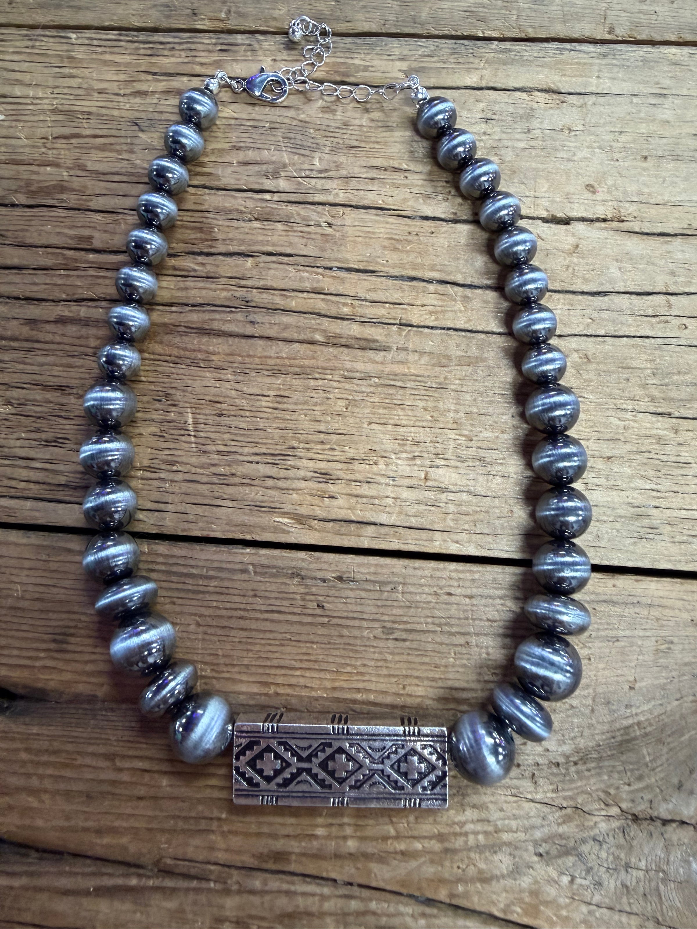 Elevate your jewelry game with this stunning Navajo Pearl Aztec Bar Necklace, where bold geometric design meets lustrous elegance. Featuring generously sized pearls that catch the light beautifully, this piece brings a touch of southwestern flair to any outfit. Whether you're dressing up for a night out or adding personality to your everyday look, this necklace strikes the perfect balance between statement-making and wearable. A true showstopper that celebrates artisanal craftsmanship and timeless style.