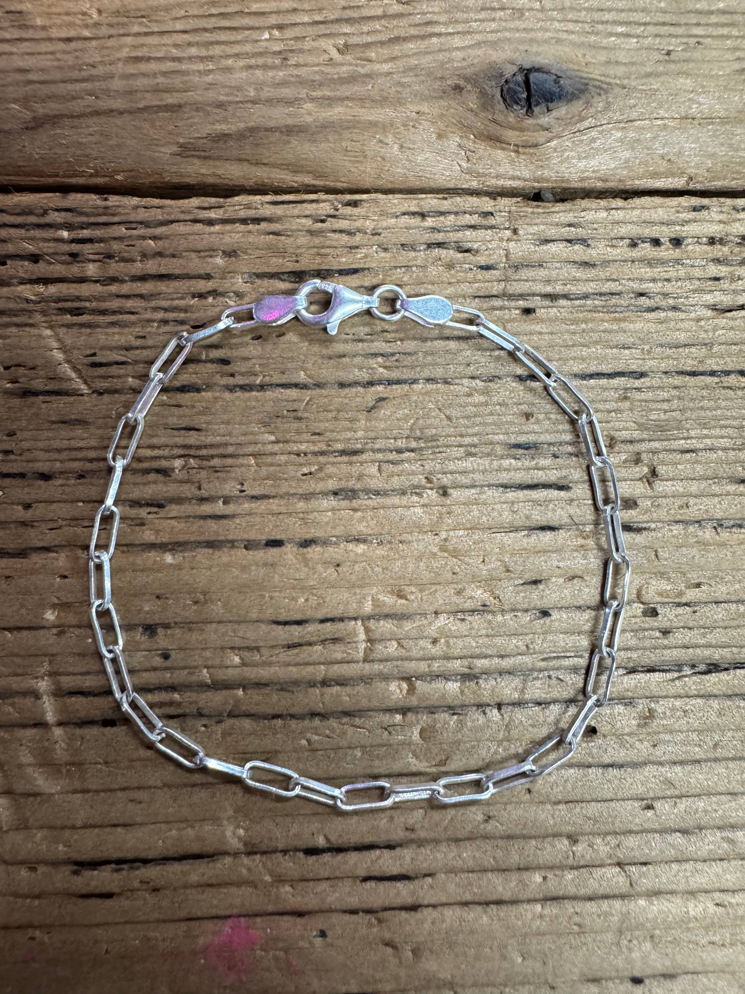 Add a touch of sparkle to your wrist with this Paperclip Chain Sterling Silver Bracelet. Its sleek, modern design brings a fun twist to a classic accessory, perfect for layering or wearing solo. Lightweight and shiny, it’s ready to brighten up any outfit with a playful edge.