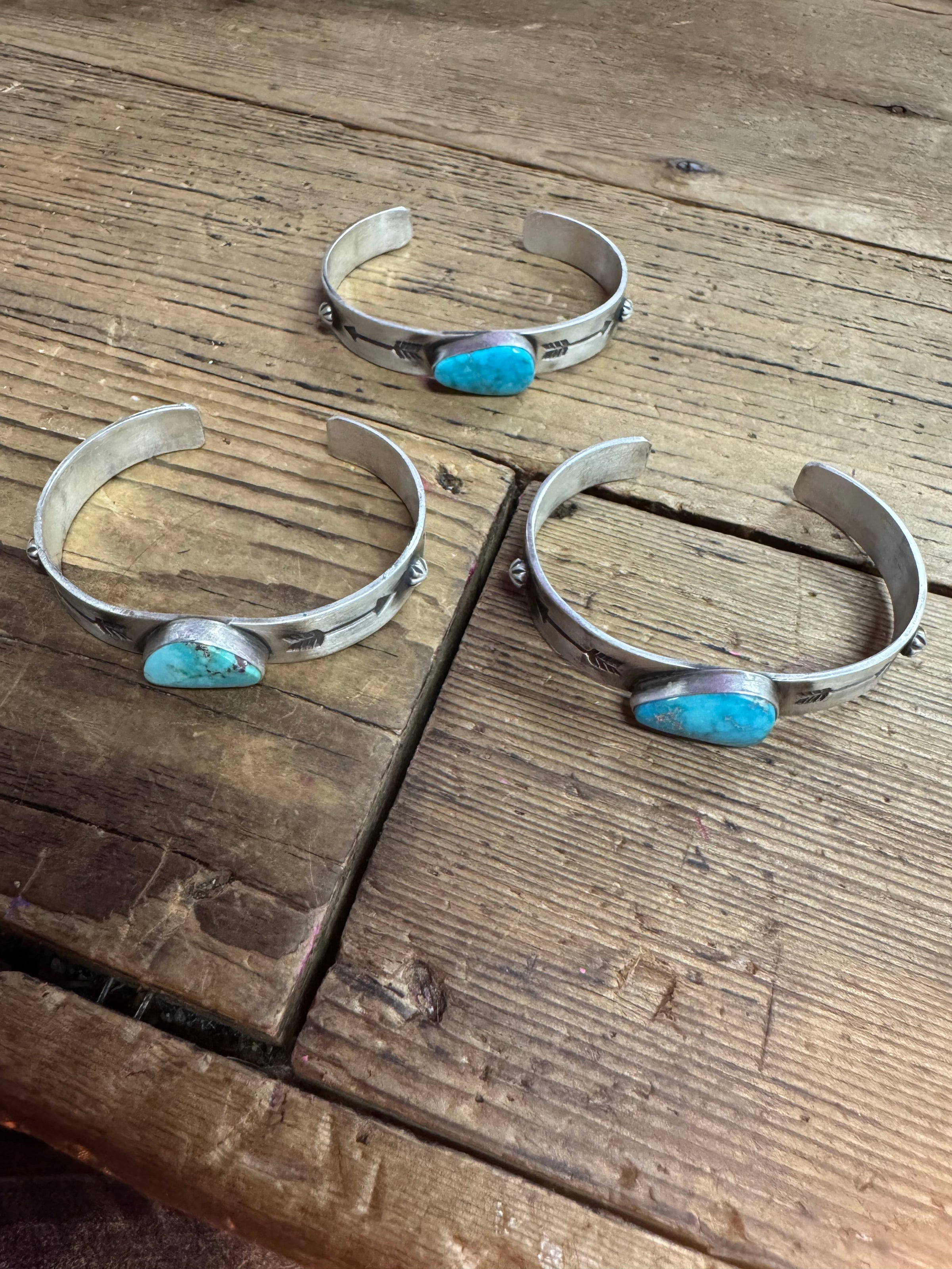 Add a splash of southwestern charm to your look with this Sterling Silver Turquoise Cuff Bracelet. Featuring intricate arrows and shining conchos, it playfully blends bold design with timeless elegance. Perfect for stacking or wearing solo, this bracelet brings a touch of adventure to any outfit.