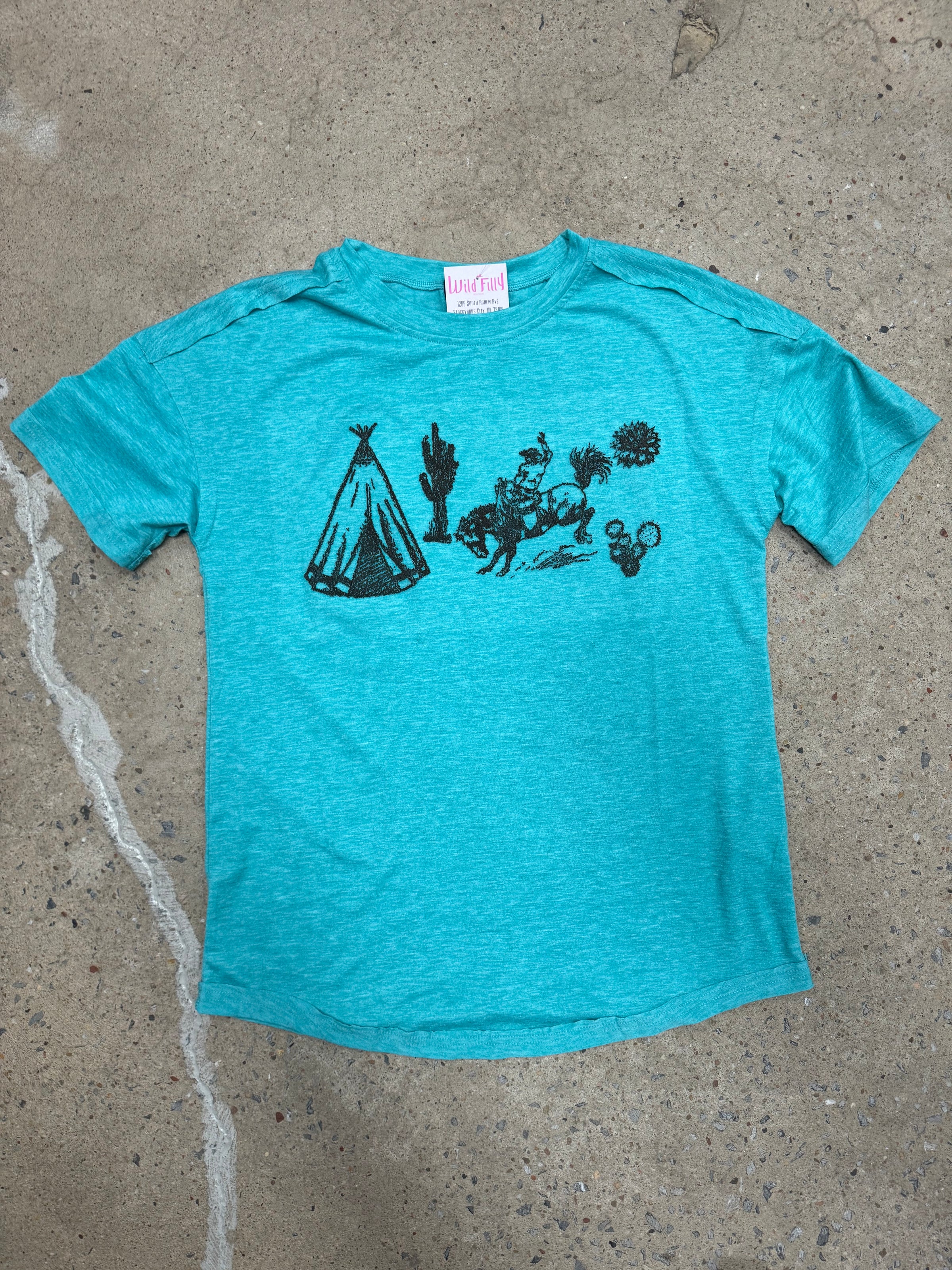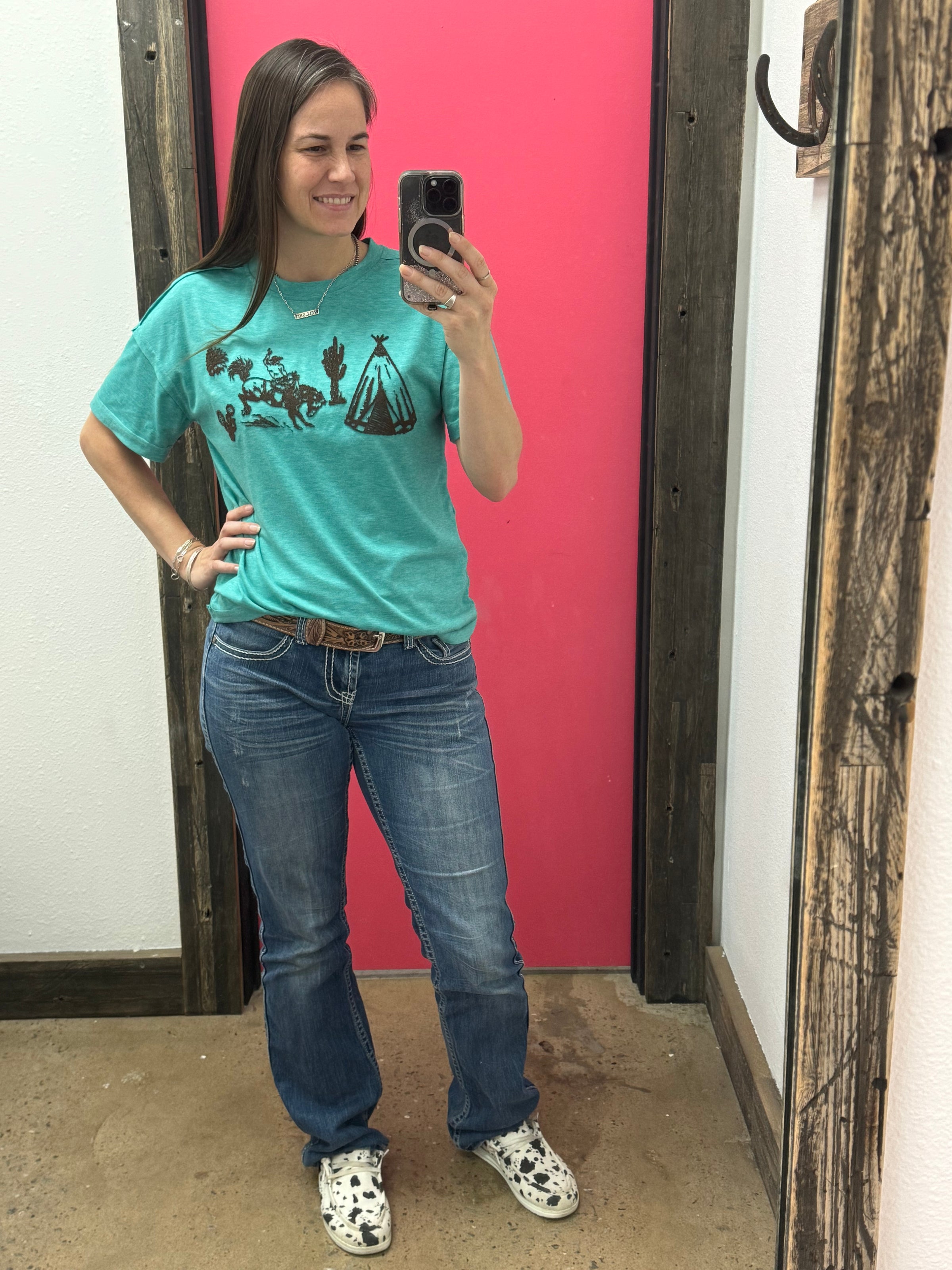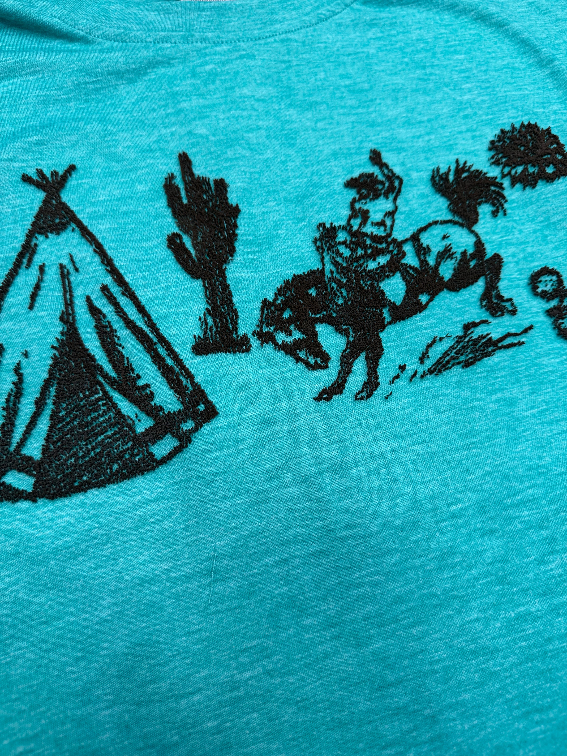 Ride in style with The Buckin' Bronc Tee! This blue shirt features stand-out brown embroidery that'll make you the talk of the rodeo. Whether you're ropin' or just kickin' back, this tee is sure to be a hit. Giddy up!