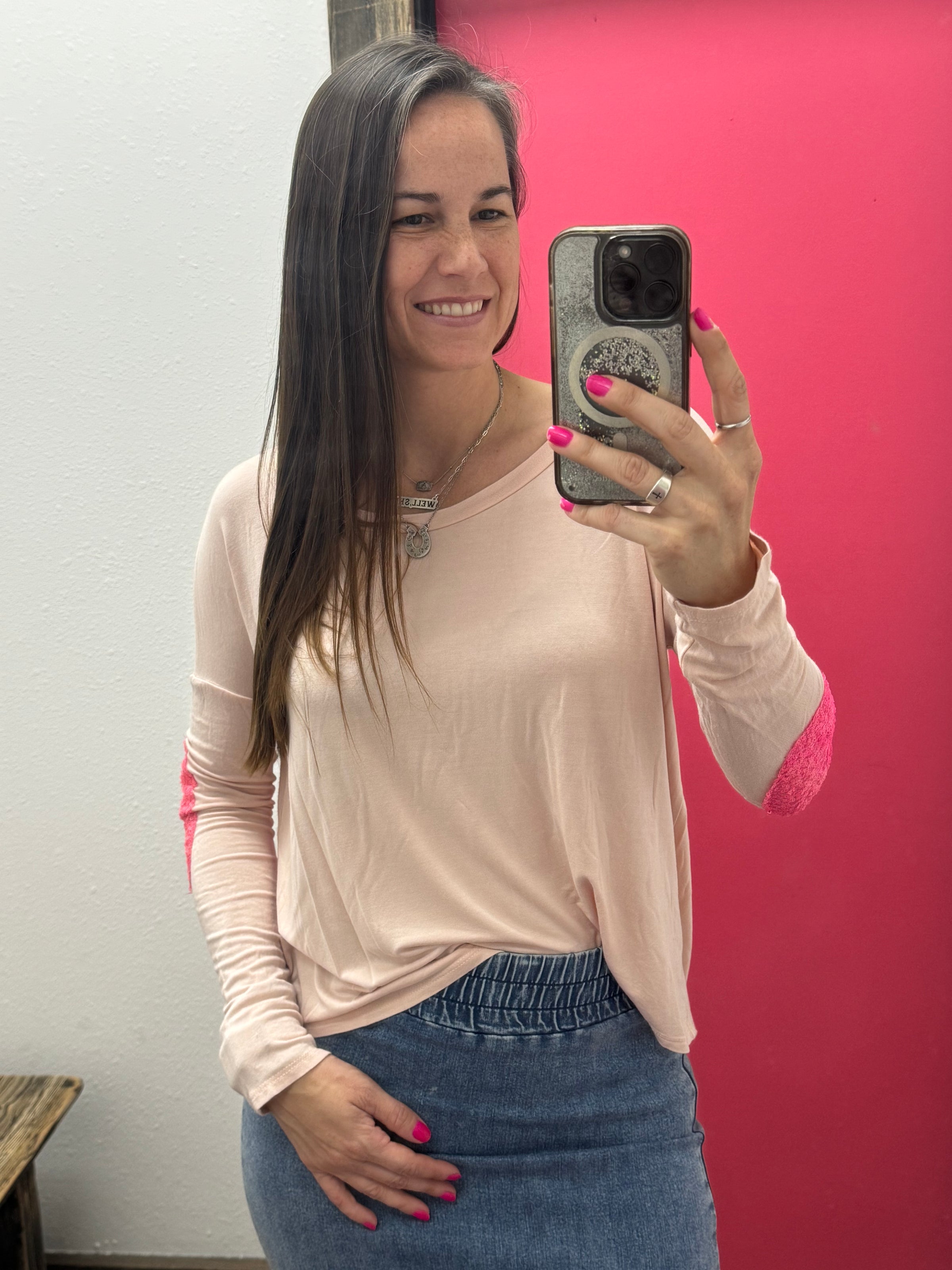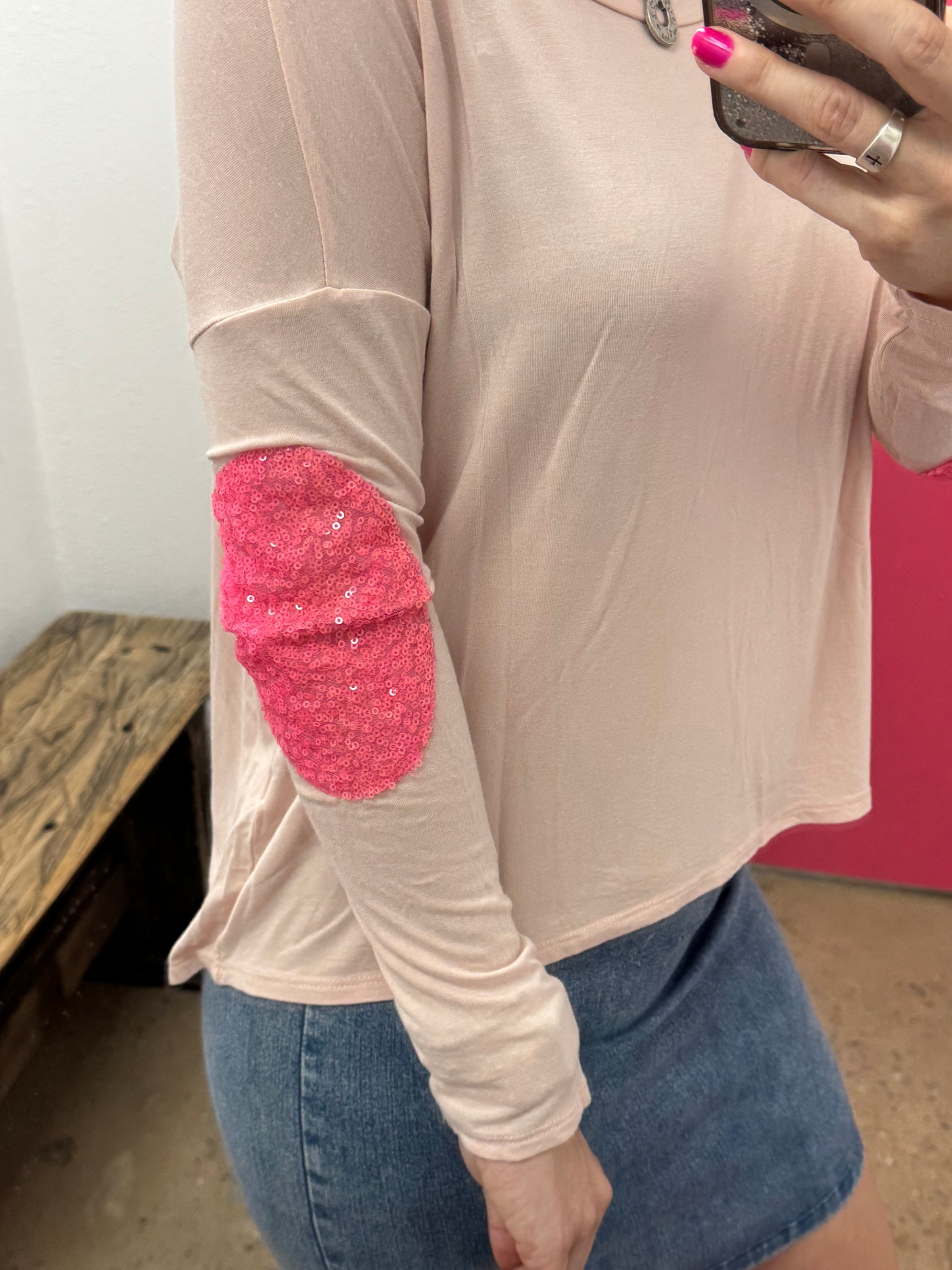 Long sleeve shirt with pink sequin elbow patch detail