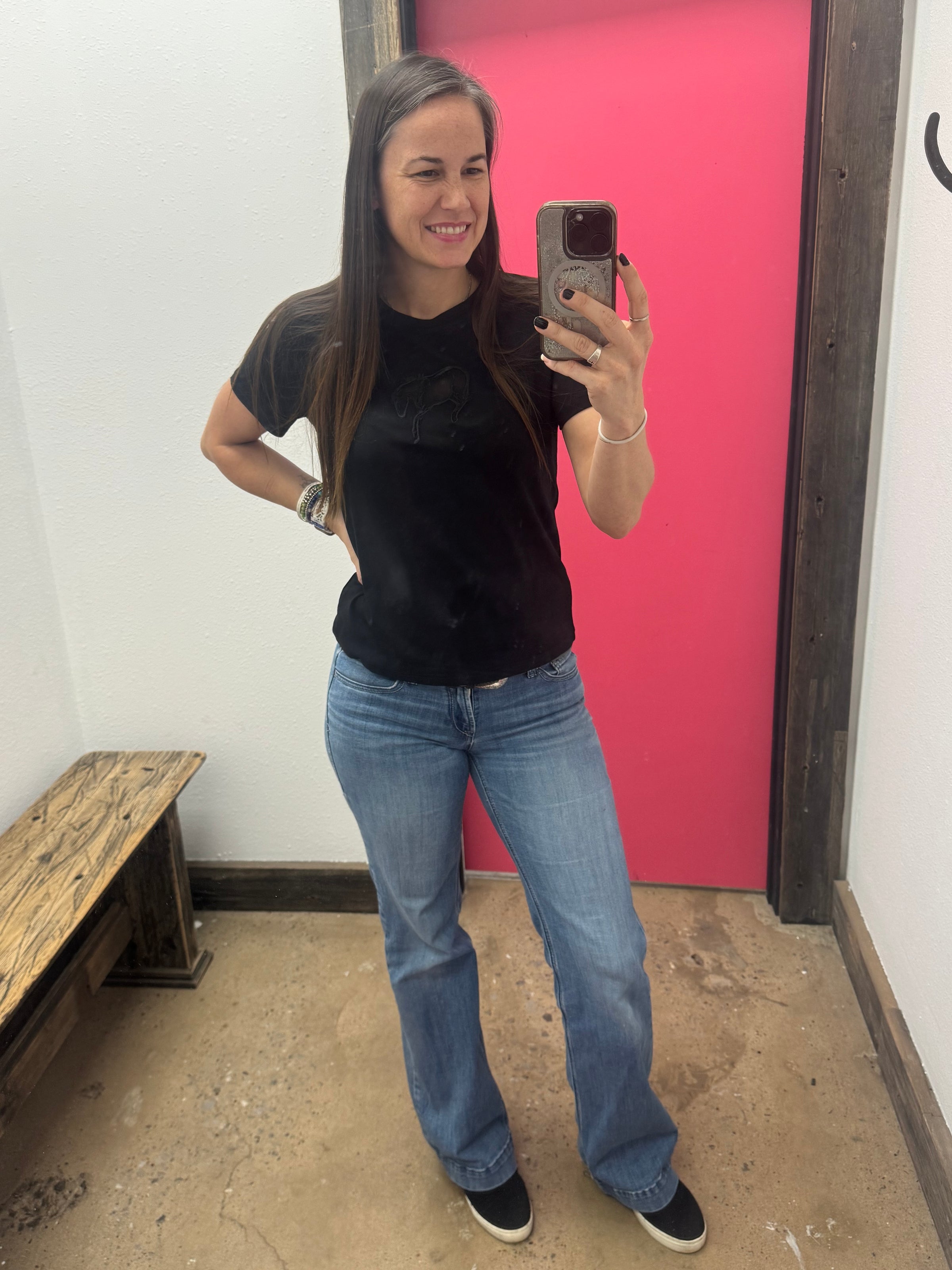 not as roomy as our typical roomy cuts but not tight fitting at all. happy medium?